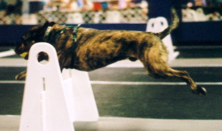 After Fagin's HD diagnosis, we began seeing Dr. Sue Ann Lesser for monthly chiropractic and, of course, I started Fagin on glucosamine and chondroitin supplements. There was consensus among Fagin's vets that agility seemed to be beneficial rather than harmful. Dr. Lesser also recommended I get Fagin trotting to help keep Fagin in shape and showed me how to stretch him. She also advised me to pay attention to Fagin's body language, that he would let me know when I was asking too much from him. I started to have Fagin jump lower at agility classes, and we continued to enjoy our times there. We also discovered flyball in the summer of 1998 and began to practice with a team. But agility trials became more and more of a struggle for us, and in February, 1999, I decided to quit agility and switch to flyball.