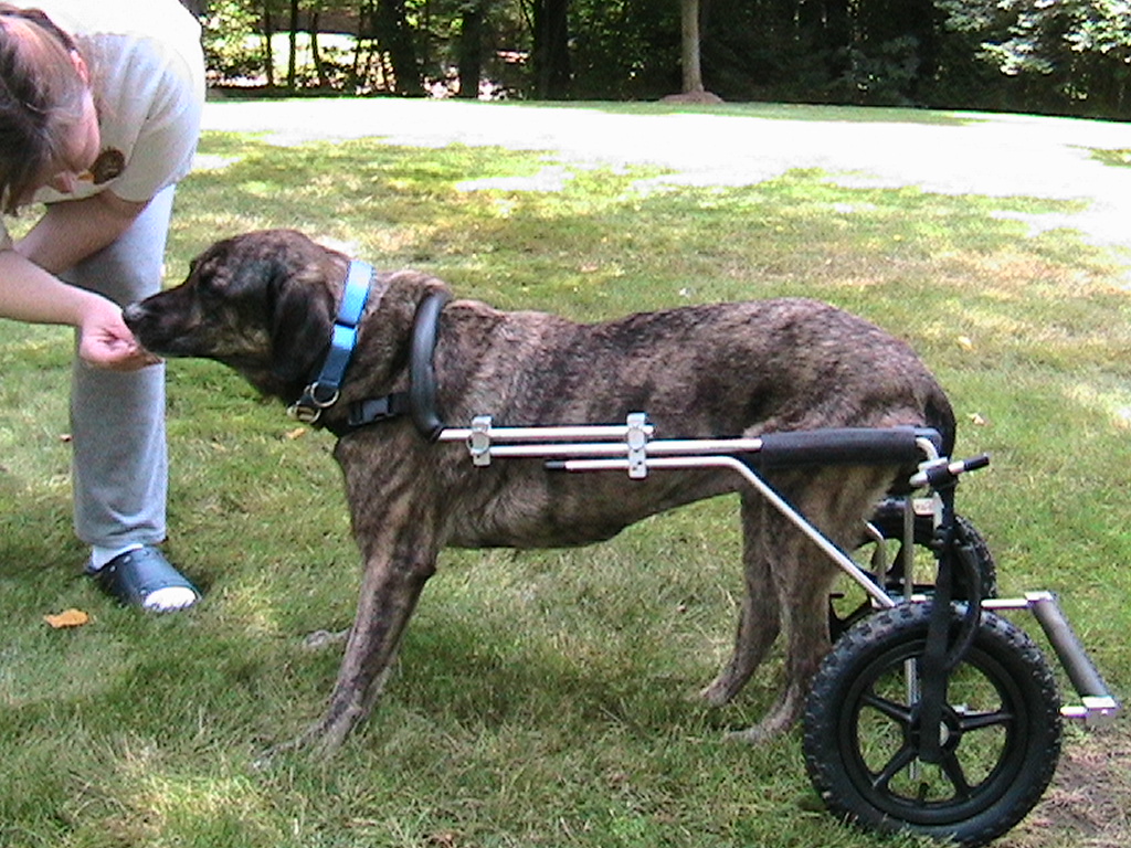 At the beginning of the summer, I wasn't sure just how much longer he would be able to walk. You just can't tell with this DaMn disease. Fortunately, I was able to borrow an Eddie's Wheels cart that fit Fagin. He never really got used to it, I think because he was just a little bit too strong to need it. I tried to get him in it every so often, and when I did, he seemed to enjoy playing keep away with his big red ball.