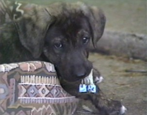 Fagin was born in San Bernardino, California, in early April, 1993. He was descended from strays that my Aunt Phyllis encouraged to live on her property. She gave them food and shelter and they gave her security in a neighborhood that had declined over the years. I'm pretty sure Fagin's grandfather was a brindle pit bull mix that I had met years earlier named Fagin and his grandmother was a German Shepherd named Lady. Sadly, Aunt Phyllis died suddenly of a massive heart attack some time in early May and it was a couple of days until her passing was discovered. It was another three days before Fagin, his mom and littermate were discovered in one of the small apartments on my aunt's property. In other words, they had gone 5 days without food & water and nearly starved to death. Fagin's mom and the other adult dogs were essentially feral and we didn't dare try to adopt them, nor could we find an organization that felt they could find the dogs appropriate homes. My mom and I weren't so sure we wanted to take on the two puppies, but my sister won us over. The puppies would belong to my sister, and my mom and I would help care for them as needed. We named them Phyllis (for my aunt) and Fagin (for their grandfather). During the time we were in San Bernardino my sister bonded most closely to Phyllis, while Fagin won my heart over. While settling my aunt's estate, we stayed with a woman who rented out rooms in her home. She, very kindly, allowed us to keep the puppies at her home. I remember being out in her backyard with the puppies when Fagin decided it would be fun to attack my shoelaces. I pulled my foot away and said a firm NO. Fagin just sat down and looked totally crushed. It turned out that this would be typical of him. He was always a softie, despite his tough guy looks.