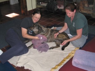 For nearly a year, I watched as Fagin ever so slowly declined. I assumed if he couldn't do something one day, that he would never be able to do it again. He also was having more trouble with his hips and began taking Rimadyl on a daily basis. In August, 2006, I was beginning to think that Fagin was on the verge of becoming a paraplegic and I finally I decided to do some research on DM. That's when I found the degenerative myelopathy list on Yahoo. I found out that DM dogs wax and wane. That just because they can't do something one day, doesn't mean they won't be able to do it the next day. I also learned just how valuable exercise is in slowing the progression of the disease. That led me to discover the Animal Rehabilitation Center in Waterford, MI and Fagin and I started to go there twice a week. Our visits to the ARC consisted of hydrotherapy in a water treadmill followed by stretches and massage. Fagin was such a good boy about the hydrotherapy, but I think it was the massages that he most enjoyed. I do know he liked going to ARC, because he always got excited when he knew we were almost there and he was always eager to go into the building.